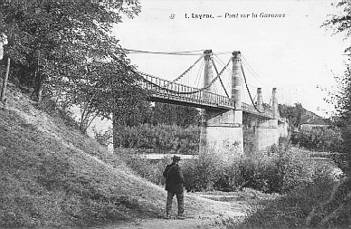 L'ordonnance royale autorisant la construction du pont de Layrac sur la Garonne, au service de la route départementale n°17 d'Agen à Layrac, a été émise le 6/1/1845 (1). L'adjudication s'est faite le 30/8/1845 en faveur du Sieur Bernard Pillore , en contre-partie d'une concession de 24 ans et 5 mois et une subvention de 120 000Fr. Le pont a été construit en 1846, et comporte 3 travées suspendues par fil de fer, pour une longueur totale entre culées de 235m pour une largeur de 4.3m (travée centrale mesure 98 m). Pour sa constructuction, il a été fait appel aux frères Escarraguel, en tant qu'entrepreneur-architecte.