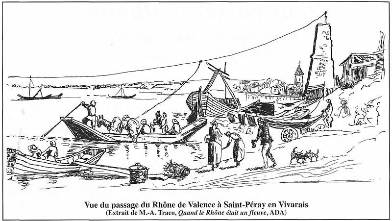 - Et par ailleurs au passage, l’autorité locale percevait quelques taxes, sources d’un profit bienvenu. L’instauration historique de péages sur les marchandises et les personnes qui franchissent le fleuve, date du Moyen Age et a fait la richesse des villes fluviales. Ces taxes portaient toutefois plus sur les denrées à forte valeur ajoutée plus que sur les produits de consommation courante (vin et sel exceptés) comme le note "Mémoire d'Ardèche" (voir Bibliographie relative à l'histoire des ponts suspendus et bacs