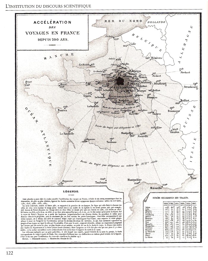 Les données relatives aux évaluations des durées des trajets sont issues du document "Carte d'Accélération des voyages en France" Ministère des travaux publics, Archives de la statistique graphique, Paris 1888.