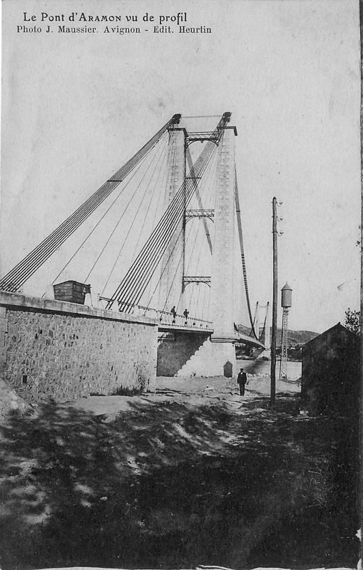 Selon (1), complété par (2), le pont suspendu d'Aramon sur le Rhône, à la limite entre le département du Gard et celui des Bouches-du-Rhône, fut construit par l'Entreprise Arnodin en 1899/1900 pour un montant de 284 000 Fr pour le constructeur et 436 000 Fr pour l'administration.