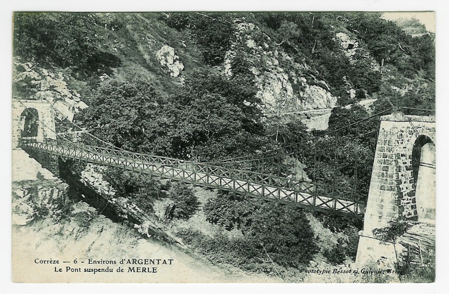 Une première ordonnance datée du 24/1/1848(2) autorise la construction d'un pont en maçonnerie sur la commune de Saint-Geniez-ô-Merle, mais une nouvelle ordonnance substitue le pont en maçonnerie par un pont suspendu le 18/3/1851(1) . Le document (3) indique un début de concession le 5/4/1857, donc vraisemblablement la date de mise en circulation dudit pont. Ce même document précise une fin théorique le 20/3/1895, soit une durée de 38 ans.