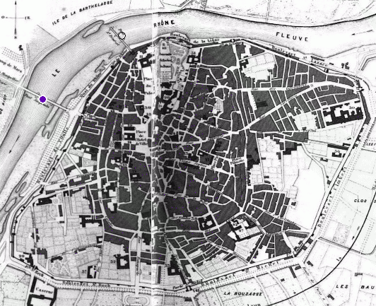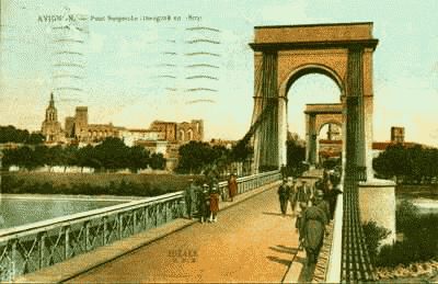 Finalement un pont suspendu est construit par la Compagnie Jules Seguin de Lyon (Jules est frère de Marc) en 1845, sur le petit Rhône, mais partant de la porte d'Oulle (côté Vaucluse). Nous pouvons supposer que les dimensions du nouveau pont sont similaires au pont qu'il remplaçait, notamment sa longueur d'environ 220m. |