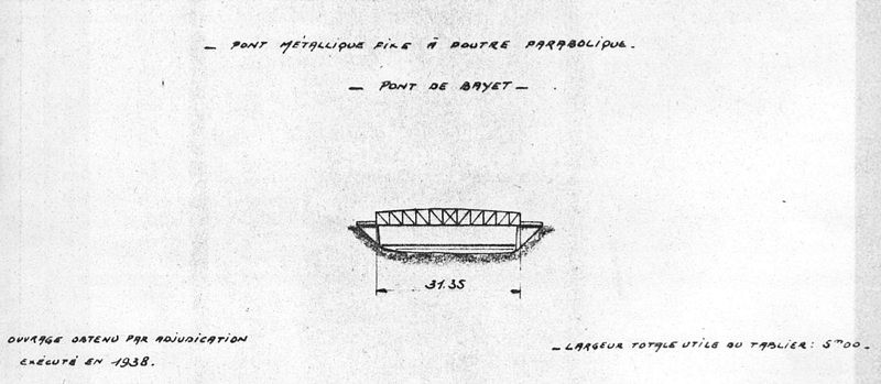 Selon (1), le pont Bayet sur la Sioule fut construit en 1938 par l'Entreprise Arnodin , travaux obtenus par adjudication. Il est alors constitué d'une poutre unique parabolique metallique, d'une longueur de 31.35m pour une largeur utile du tablier de 5m.