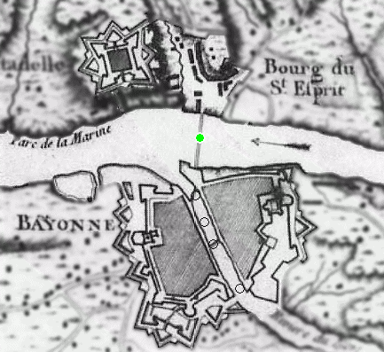 La première pierre du pont St Esprit, qui relie Bayonne au Faubourg (du) Saint-Esprit semble avoir été posée selon (1 -p23) en 1149, car dès lors le marché de Bayonne attire, par se produits maritimes, nombre de clients des Landes, du Béarn et de la Navarre ! La paix conclue entre la France et l'Espagne le 7 Novembre 1659, fut fêtée à Bayonne le 1er Mai 1660, par le Roi lui-même. Le pont Saint-esprit, alors déclaré comme l'un des plus beaux d'Europe, est alors bordé de 400 à 500 Mousquetaires. Toujours selon (1 -p193-195), le 25 Janvier 1701, le lendemain de la visite du Roi d'Espagne Philippe V d'Espagne, le pont fut rompu par une crue extraordinaire qui emporta plus de la moitié des piles. Ce même jour, nombre de vaisseaux marchands, stationnés dans le port coulèrent!