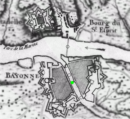 Tous les ouvrages, Pont Saint-Esprit - Bayonne - 1149, Pont temporaire de bateaux - Bayonne - 1794, Pont Saint-Esprit - Bayonne - 1812, Pont de bateaux de Bayonne - 1814, Pont St Esprit en bois - Bayonne - 1817, Pont de bateaux de Bayonne - 1830, Pont de pierre de Bayonne - 1851, Premier pont Majour - Bayonne - 1140, Pont Majour en bois(Mayou) - Bayonne - 1808, Pont Mayou (Majour) - Bayonne - 1857, Pont Marengo de Bayonne - 1864, Pont Pannecau - Bayonne - XIIème siècle, Passerelle suspendue - Bayonne - 1841, Pont du Génie à Bayonne - 1799,Références :