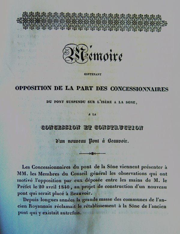 Stratégique donc pour le développement de Saint-Marcellin mais réduisant de fait l'attrait des deux ponts en amont et en aval, ce fut donc l'objet de maintes attaques des opposants, M. Mallein en tête maire de La Sône et adjudicataire du pont de la Sône. Xavier Seguin (sans lien direct apparent de parenté avec Marc Seguin et ses frères) alors maire de Pont-en-Royans fut aussi ardent défenseur du projet. |