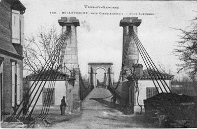 L'autorisation de la construction du pont suspendu sur la Garonne à Belleperche à proximité de Cordes-Tolosannes, fut publiée par l'ordonnance royale du 26/6/1839 (2). La date indiquée dans le rapport pour la mise en circulation de "2/9/1839", n'est guère crédible. Tout autant imprécise est la date de 1839-1844 indiquée en (4). Comptons qu'il a fallu a minima 18 mois pour assurer la construction dudit pont. Selon (4) le pont est constitué de 2 travées suspendues par fil de fer, constituant une longueur du pont entre culées de 150m et une largeur de 5.5m. Léon Busquet est confirmé constructeur par (5).