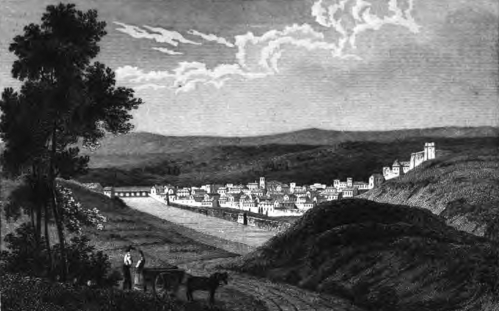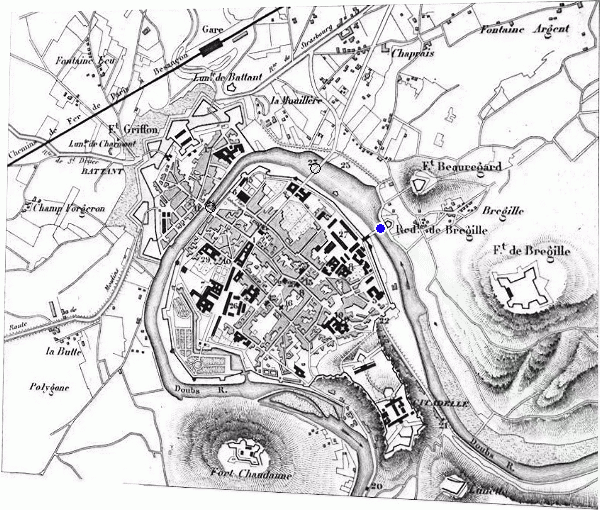 La gravure ci-contre montre le pont de Brégille en place, en face de la porte fortifiée d'accès à la ville, mais le pont des Chaprais n'est toujours pas présent --> elle date vraisemblablement de 1837.