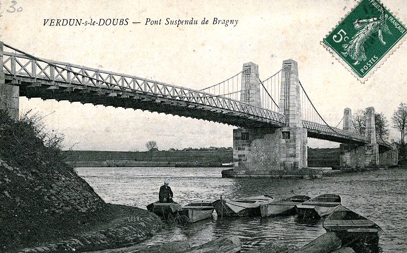 Le pont suspendu de Bragny a été construit , établissant une liaison routière entre les communes de Bragny et de Verdun-sur-le-Doubs, séparées par la Saône. Le processus d'adjudication des ponts de Bragny et de Chauvort a été un peu particulier, puisqu'initialement n'était prévu que le pont de Bragny (sur la Saône) (ordonnance du 21/4/1836 adjugée au sieur Boulland), en remplacement du bac du même nom. Mais suite à différentes réclamations et propositions, cette ordonnance initiale pour un pont se transforme le 22-08-1837 en ordonnance pour deux ponts, celui du passage de Chauvort et celui de Bragny, travaux et concession adjugés de facto au même Sieur Boulland. Les deux ponts ont été construits simultanément en 1840-41. |