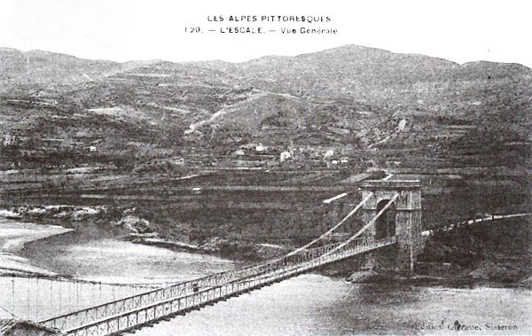 La construction de ce pont a été décidée par le Député Gravier comme le Premier pont suspendu de Mirabeau . L'ouvrage "L'ami de la religion" Pont de Sassenage à Grenoble , quelques années auparavant. Il a resisté à la crue de 1843. Il permettait alors une liaison SISTERON-DIGNE plus courte et plus commode que par la route tortueuse de VOLONNE. |