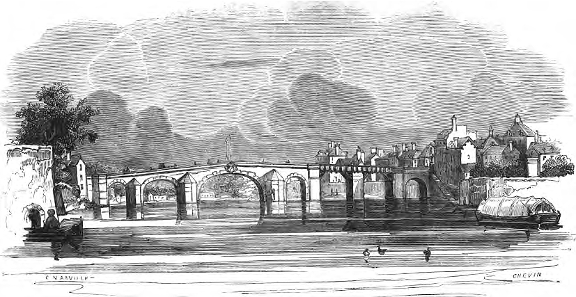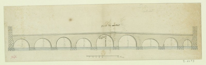 En 1727, un nouveau pont a été édifié sous l'ordre de Louis XV. En effet, le roi l'empruntait régulièrement pour aller à Etiolles rendre visite à la marquise de Pompadour. L'ouvrage, composé de sept arches, a tenu près de deux siècles avec toutefois quelques remaniements. Il fut endommagé par la crue de janvier 1802. En 1814, dans l'intérêt de la défense nationale, deux arches de la rive gauche ont été détruites par le génie militaire. Selon (4), il est composé au début du XIXème siècle de 7 arches de pierre cintrées surbaissées, de 8.8 à 20.8m, pour une ouverture cumulée des arches de 83.4m. |