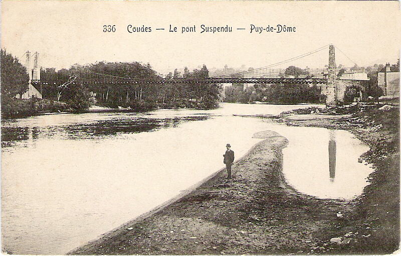 La construction du pont à Coudes sur l'Allier fut autorisée par l'ordonnance du 4/9/1842 (3). Selon (2), ce pont fut construit en 1846. Il comporte alors une travée unique suspendue par fil de fer, de 100m de long pour 4.4m de large.