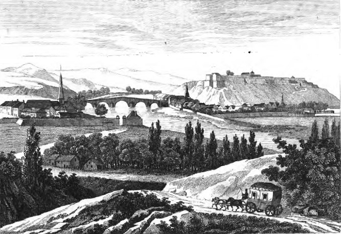 Le pont de Givet, situé sur la route de Paris à Wesel, sur la Meuse, fut construit sous l'impulsion de l'Empereur Napoléon. En effet revenant de Belgique, l'Empereur arrive à Givet alors que la Meuse avait rompu l'Ancien Pont de Givet en charpente , rongé par la vétusté. Ce contre-temps contrarie l'Empereur qui voulait passer à tout prix. Alors qu'aucun batelier n'accepte de passer en barque, l'Empereur fait appel à des prisonniers anglais en dépôt dans la ville. Avec l'appui de 20 volontaires, l'Empereur passa sur l'autre rive, et en récompense, offrit à ces 20 prisonniers, la liberté, un habillement et une récompense financière! Il ordonna par ailleurs la construction de ce pont qui est engagée en 1812 (reférence (1)). La construction semble achevée en 1816 (référence (2)). Le pont est alors constitué de 5 arches de pierre, 4 piles et 2 culées, offrant chacune une arche de halage. M. Husson, ingénieur ordinaire, en fut l'architecte. |