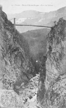 Ce pont fut parmi les premiers construit par Ferdinand Arnodin. Il a été construit sur les fonds des deux communes concernées de Cusy et Gruffy. Son devis initial de 60 000 Fr fut approuvé le 29/4/1887 et le 12/2/1888 il était livré à la circulation ! (10 mois de chantier seulement). Large de 2.2m, et long de 64 m, il surplombe "l'Abîme" de 94 mètres.