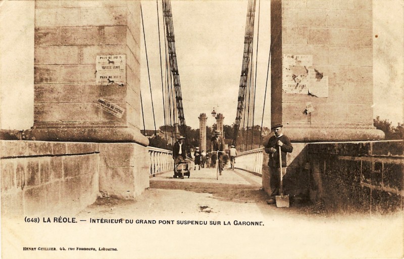 L'ordonnance royale autorisant sa construction de ce pont sur la Garonne et approuvant l'adjudication des travaux et de la concession à M. Bayard de Vingtrie passée le 26/9/1833, date du 28/1/1834 (1). La création de la Société des 4 ponts de la Garonne (3) précise la mise en commun des moyens de MM Seguin et Bayard pour la réalisation des 4 ponts (Port Ste-Marie, Tonneins, La Réole et Marmande). L'ouvrage (2) précise que le pont fut construit en 1835. Il est alors constitué d'une travée unique suspendue par chaînes de fer de 165m de long et 4.45m de large.