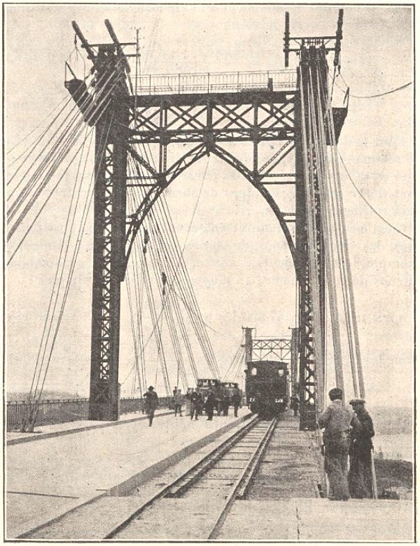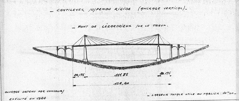 Ce pont est de type nouveau : un pont cantilever suspendu rigide, dérivé du pont Gisclard. La caractéristique particulière de ce nouveau type cantilever suspendu rigide réside dans le fait que les câbles de la membrure inférieure des fermes triangulées du type Gisclard sont supprimés : ce sont les poutre de rive du tablier qui jouent içi, économiquement, le rôle de la membrure inférieure des fermes de suspension. L'ouvrage comporte 3 travées distinctes, dont la travée centrale a 112 mètres de portée et les deux autres 21, 37 m chacune seulement. Les piliers sont en béton armé et fretté.