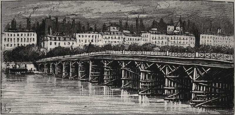 Selon les ouvrages ci-dessus, le pont Morand est à son origine un pont en bois établi sur le Rhône. Le décret autorisant sa construction moyennant une concession sur le péage de 99 ans, fut publié le 4/1/1771. Il fut ouvert le 1/7/1775 (4).