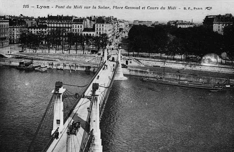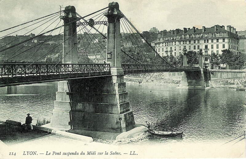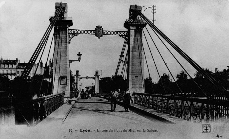 Le pont Napoléon établi en 1847 sur la Saône a une longueur de 123,75m. Il présentait deux travées fixes et une travée de 79,79m suspendue par 8 cables supportées par des obélisques en pierre. La largeur du pont est de 7 mètres, soit une chaussée de 4,80 m et deux trottoirs de 1,10 m. Ses piles, comme celles du pont sur le Rhône (voir ci-dessous), sont à pointe pyramidale.