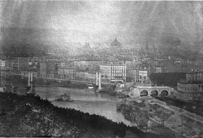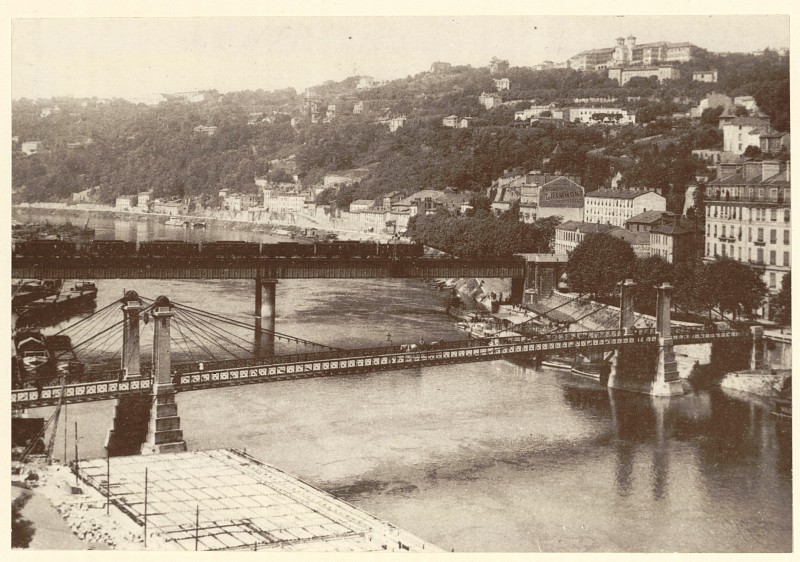 Vers 1852-1856, un pont ferroviaire desservant la future gare ferroviaire de Perrache est établi juste en aval du pont ci-dessus, comme illustré ci-contre. |