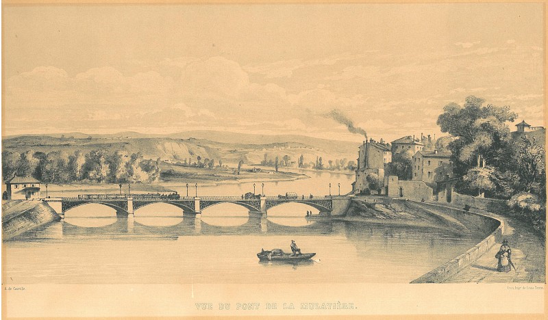 "Le Viaduc de la Mulatière (Lyon) est mis en service en juin 1845. Le Guide de l´étranger à Lyon (7), de 1847, en donne une description assez précise (annexe 3). En 1854, le pont est élargi à une 2ème voie de chemin de fer (AD Rhône. S 2034).