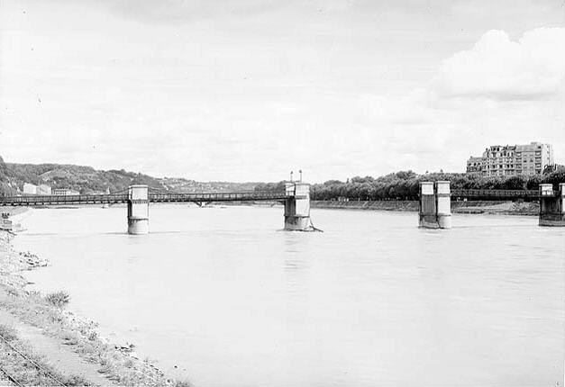 Malgré la destruction partielle de 1944 (voir ci-contre), ce pont subsistera sous cette forme jusqu'en 1952, où il fut démoli pour être remplacé par le pont en béton que nous connaissons aujourd'hui. |