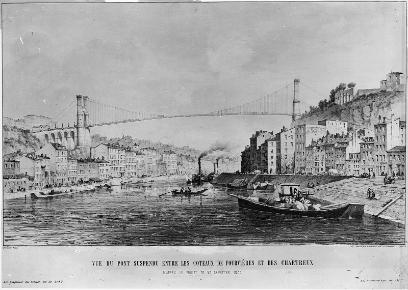 Il est interessant comme noté dans (5) que vers 1840 un projet audacieux de pont suspendu entre les Chartreux et Fourvière est proposé et très largement discuté. Son auteur est l'architecte du pont de La Caille Paul-Léon Lehaître et son projet en reprend les traits principaux comme représenté ci-dessous :
