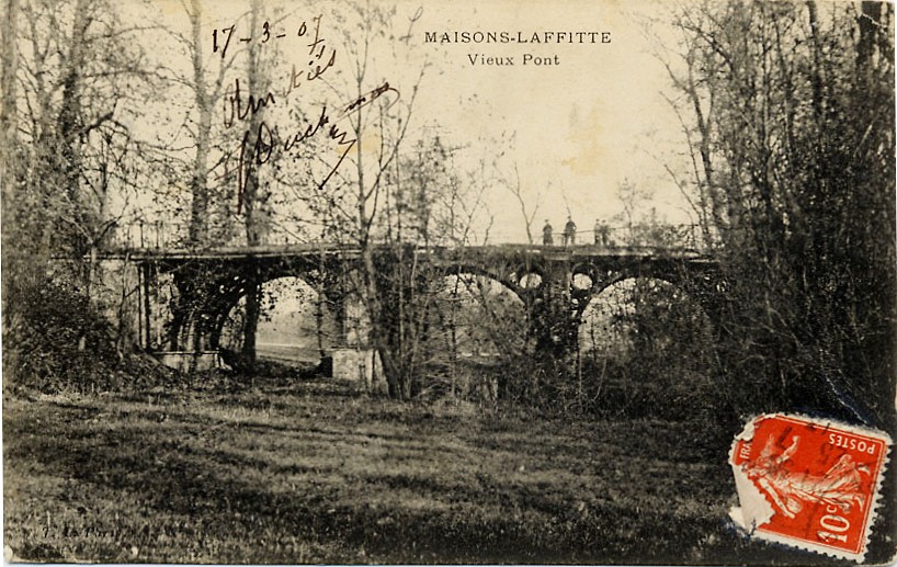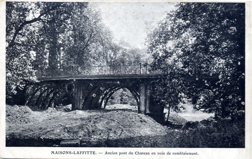 Ce pont, établi sur un saut de loup de 7 mètres de largeur, par M. Polonceau ne devait d'abord se composer que d'une arche en pierre ; mais le nouveau propriétaire du domaine de Maisons, M. Laffitte, désira qu'il fût en fonte et eût 3 arches au lieu d'une , et c'est en conséquence de ses intentions qu'il a été construit. Son tablier est en bois. Nous ne connaissons pas la date exacte de sa destruction, suite au remblaiement du saut de loup, mais comme montré ci-dessous, celle a du avoir lieu au début du XXème siècle.