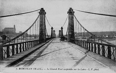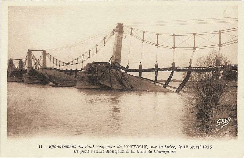 La construction du pont de Montjean qui le relie à Champtocé, au service des deux routes stratégiques n°32, de Montjean à Jallais, et n°15 , de Champtocé à Craon, en franchissant la Loire, fut autorisée par le décret du 28/8/1840 (1). Le pont fut livré à la circulation le 30/6/1850. Selon (2), il est alors constitué de 6 travées suspendues par fil de fer, pour une longueur totale de 624m et une largeur de 7.2m.