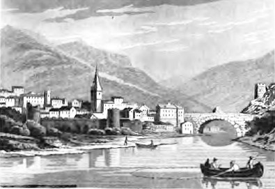 Extrait de l'ouvrage (1) :"Ce pont est remarquable par la hardiesse de sa construction. Il est d'une seule arche, en pierres de taille, de 20 toises de largeur sur 8 ou 10 de hauteur, suivant que les eaux creusent ou élèvent le lit de la rivière. La maçonnerie de ses piles n'a que 2 toises d'épaisseur, mais elle est fortifiée de part et d'autre part de grands éperons. Au sommet de son cintre s'élève une petite tour carrée de 2 toises, sous laquelle on passe. Il y a eu long-temps des portes dans cet endroit du pont, pour admettre, refuser ou arrêter les passans, et assurer la perception d'un péage.