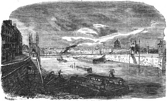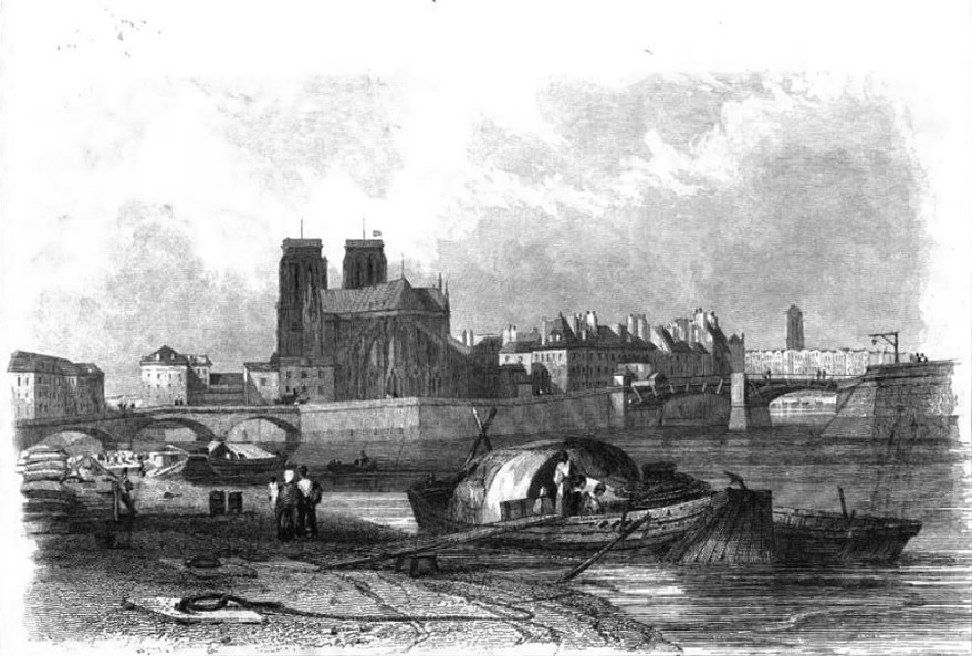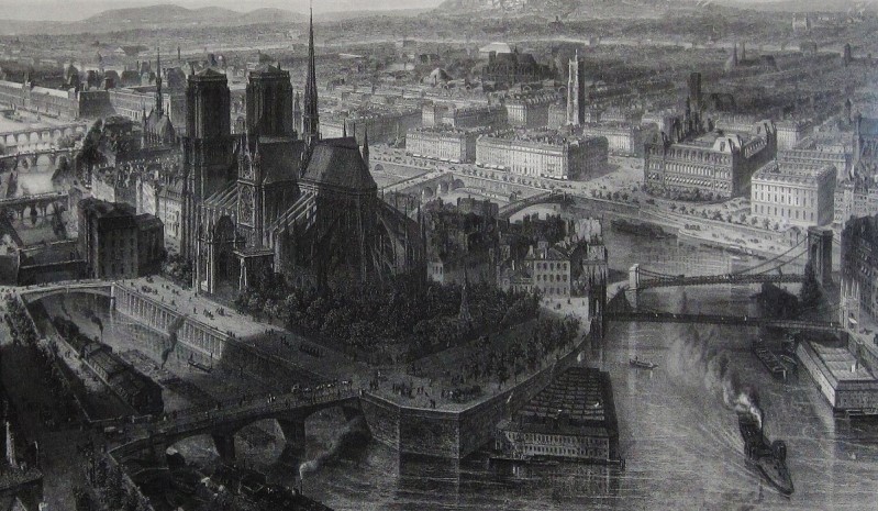 La passerelle suspendue reliant l'Île de la Cité à l'Île St-Louis apparaît sur ces gravures à droite et à gauche (Sur l'extrait de gravure à droite, la passerelle apparaît en premier plan à droite). Les piles adossées aux berges, ont une architecture particulièrement travaillée, avec semble-t-il quatre chapiteaux bien originaux. Selon (3) : "On a cherché à harmoniser cette invention moderne avec le style de la cathédrale et avec celui de la fontaine gothique qui a été élevée, il y a une dizaine d’années, pour compléter les embellissements de cette partie de la Cité." En arrière-plan de cette passerelle apparaît l'autre pont suspendu, le pont Louis-Philippe, qui relie d'une seule traite Paris et ses deux iles, et dont la pile centrale repose sur l'Île Saint-Louis. |