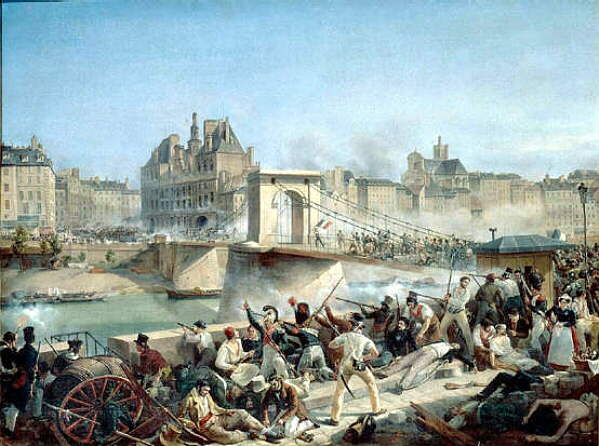 Ce pont a une histoire bien particulière car il fut au coeur de la révolution de 1830. Pour mémoire, Charles X fit publier le 25 Juillet 1830 dans le Moniteur, des Ordonnances qui établissaient une censure rigoureuse de la presse, dissolvaient la Chambre des Députés nouvellement élue, et modifiaient le système électoral en faveur des candidats conservateurs. Trois journées d'émeutes s'en suivirent, au terme desquelles la Restauration s'effondre. Ce troisième jour, le 28 Juillet 1830, les insurgés livrèrent un dur combat sur notre pont pour réaliser la prise de l'Hôtel de Ville, comme le montre le tableau ci-dessous.