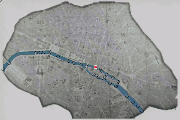 Il est à remarquer cependant que le nouveau pont ne forme pas le prolongement du boulevard de Sébastopol, rive droite. L'administration municipale a été déterminée dans le choix de son emplacement, d'abord par le désir de, conserver les ruines romaines des Thermes de Julien qui auraient dû disparaître si l'on avait prolongé sur la rive gauche l'alignement du boulevard sur la rive droite, et ensuite par la nécessité de faire servir le nouveau pont non-seulement au débouché du boulevard, mais encore à celui de la rue qui est déjà commencée sur la place du Châtelet et qui doit être prolongée jusqu'aux halles centrales.
