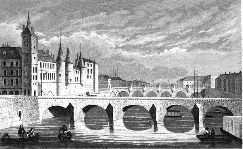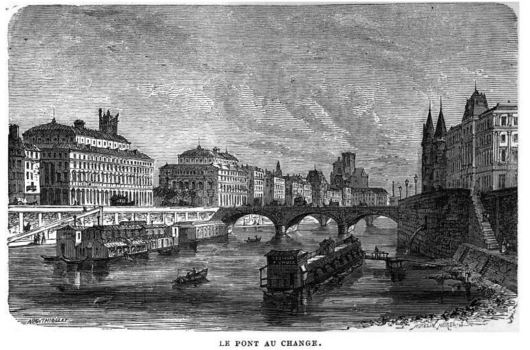 Le Pont au Change était aussi un des plus anciens et, parmi les anciens, le plus large des ponts de Paris. Le Pont-au-Change, s'appela initialement Grand Pont, construit par le roi Charles le Chauve, et dont on a retrouvé des vestiges considérables lors de la récente construction du grand égout collecteur de la rive droite. L'appelation Pont-au-Change date de 1140, date à laquelle les changeurs s'y établirent. Ils y restèrent jusqu'au XVIème siècle. L'ancien pont a été détruit souvent par les eaux ou par le feu, et, sur des emplacements tout voisins on en construisit successivement deux autres, le pont Marchand et le pont au Change, qui existèrent quelque temps simultanément. Le pont au Change fut reconstruit en 1646, avec deux rangées de maisons qu'on fit disparaître en 1786, comme indiqué par (4).