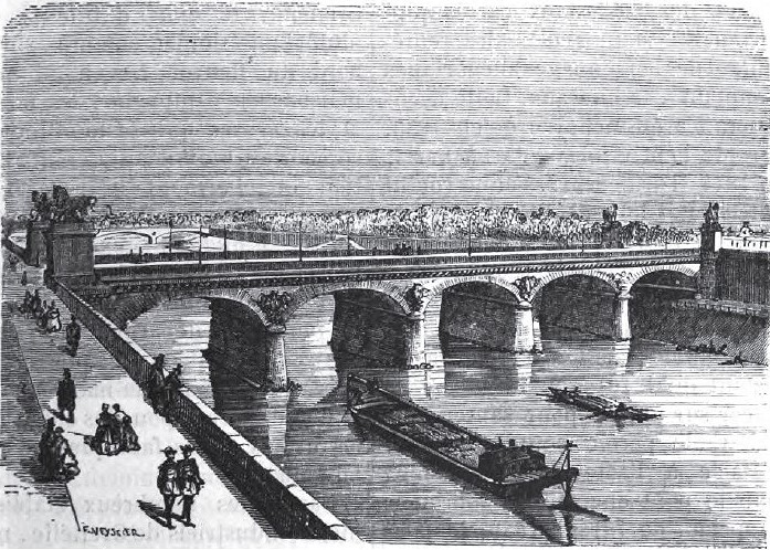 Le pont d'Iéna a été construit par M. Lamandé qui venait de terminer celui d'Austerlitz dont nous avons parlé cidessus. Il est composé de cinq arches en arc de cercle ayant chacune 28 mètres de corde sur 3,30mde flèche. Ces arcs avaient été primitivement projetés en fonte comme ceux du pont d'Austerlitz, mais un décret impérial en date du 27 juillet 1808, a ordonné leur construction en pierre. Leurs naissances sont à 6,13m au-dessus de l'étiage et leurépaisseur à la clef est de 1 ;44m. Elles reposent sur quatre piles et deux culées. L'épaisseur des piles est de 3 mètres et celle des culées de 15 mètres. Ces dernières sont fondées sur pilotis : celle de rive gauche a été construite dans un caisson échoué sur les pieux recepés, et celle de rive droite sur des racinaux et une plate-forme établie à 0,44m au-dessous de l'étiage.