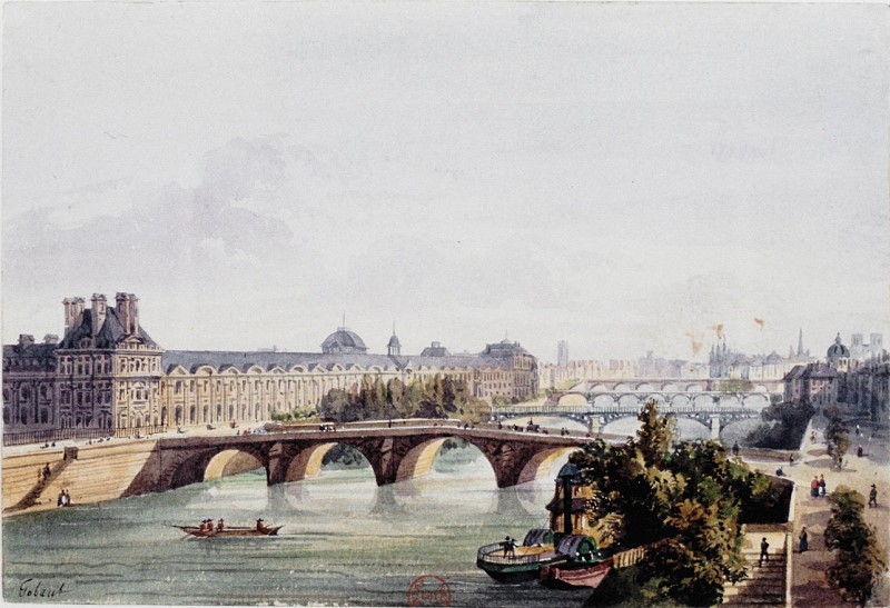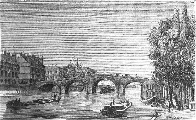 Ce pont était en bois et fut brûlé en 1656, ainsi qu'une machine établie à côté pour élever l'eau. Le sieur Laurent Tonti proposa alors de le reconstruire avec le produit d'une loterie, ce qui donna lieu aux lettres patentes de 1656; mais cette loterie n'eut probablement pas de suite, car le pont fut reconstruit en bois, et ayant été emporté le 20 février 1684 par une débâcle de glaces, Louis XIV résolut de le faire rétablir en pierre de ses deniers, tel qu'il existe maintenant.