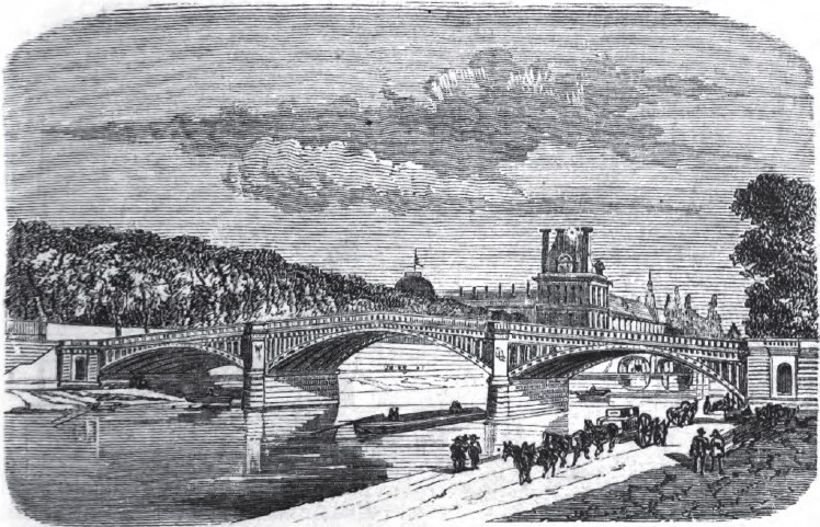 M. Fontaine, membre de l'Institut et architecte de la couronne, considérait un pareil passage comme devant être d'abord obscur et humide, et de plus d'un effet très-disgracieux; il proposait de le remplacer par un escalier à double rampe montant sur la terrasse; mais cet escalier aurait été fermé au public le jour des promenades de la famille royale. Une pareille réserve en frappant pour ainsi dire d'interdit le passage sur la passerelle les jours où l'accès de la terrasse aurait été défendu était de nature à éloigner un concessionnaire, et c'est en effet ce qui est arrivé. Cependant comme on sentait de plus en plus le besoin de rendre le jardin des Tuileries plus accessible aux habitants du faubourg Saint-Germain, et d'établir à travers ce jardin une communication plus directe avec les quartiers qui avoisinent la place Vendôme, la question a été reprise après la révolution de 1830, mais aucune solution n'était intervenuelorsqu'en 1858 les ingénieurs reçurent l'ordre d'étudier un projet. L'administration avait d'abord eu la pensée de faire construire une passerelle fixe pour piétons, en lui donnant 12 mètres seulement de largeur, et en la plaçant dans le prolongement de l'allée transversale des Tuileries, au droit de la rue de Castiglione. On devait toutefois disposer les piles et les culées de cette passerelle de manière à pouvoir lui donner plus tard 20 mètres de largeur, et la livrer alors à la circulation des voitures. Le projet étudié dans cette double hypothèse évaluait la dépense à 920 000 francs dans le premier cas et à 1 225 000 francs dans le second.