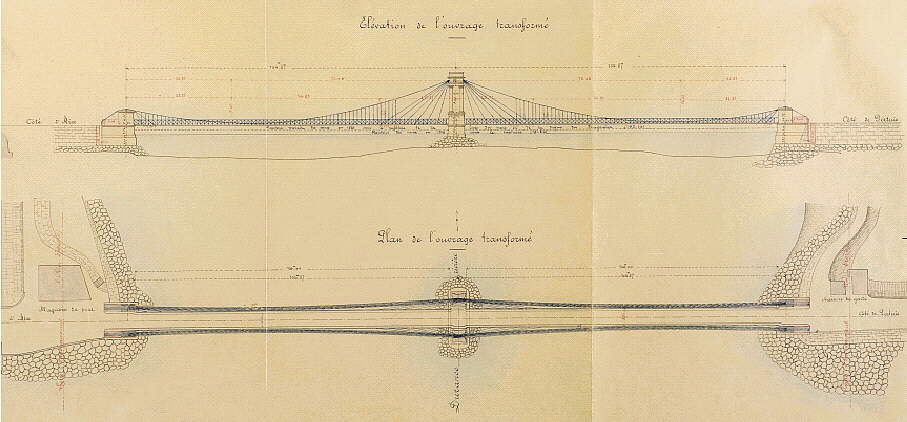 Conformément au cahier des charges de 1833 et à la loi du 30 Juillet 1880 sur le rachat des concessions des ponts à péage, les départements de Vaucluse et des Bouches-du-Rhône prennent possession du pont suspendu le 23 octobre 1883. Des réparations et des modifications de l’ouvrage sont aussitôt envisagées, notamment par le prolongement et l’adjonction d’une nouvelle travée de 100 mètres de portée en même temps que la réfection complète du système de suspension. Ce programme n’a pas été réalisé. Ce n’est qu’en 1901 que des travaux sont effectués. Le nouveau projet comprend la restauration de la suspension et la construction d’un guideau à la pile destiné à améliorer l’écoulement des eaux. Ces travaux ont coûté 145 000 F aux deux départements. C’est Ferdinand Arnodin , qui a été sollicité pour ce projet.