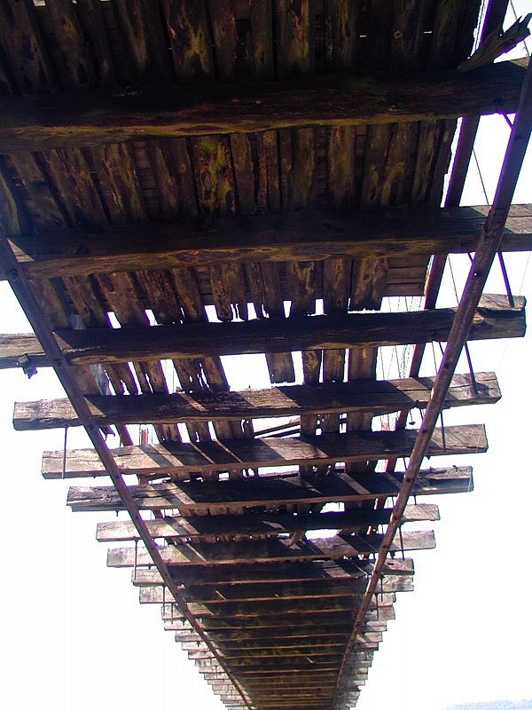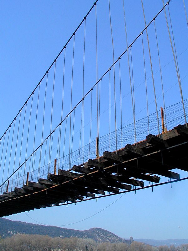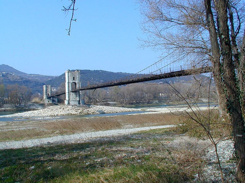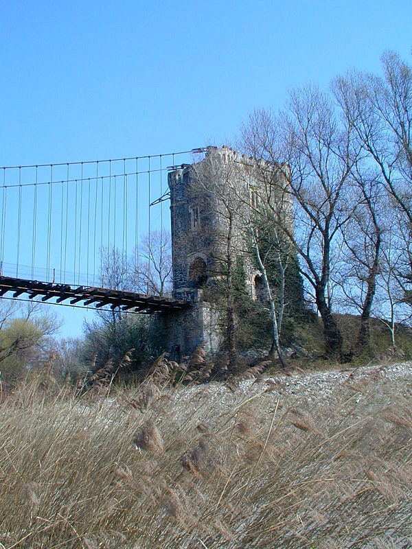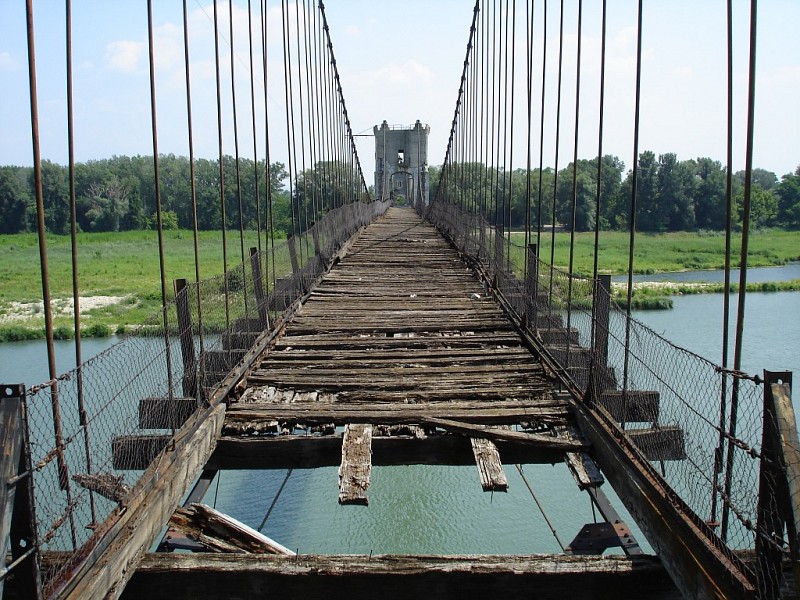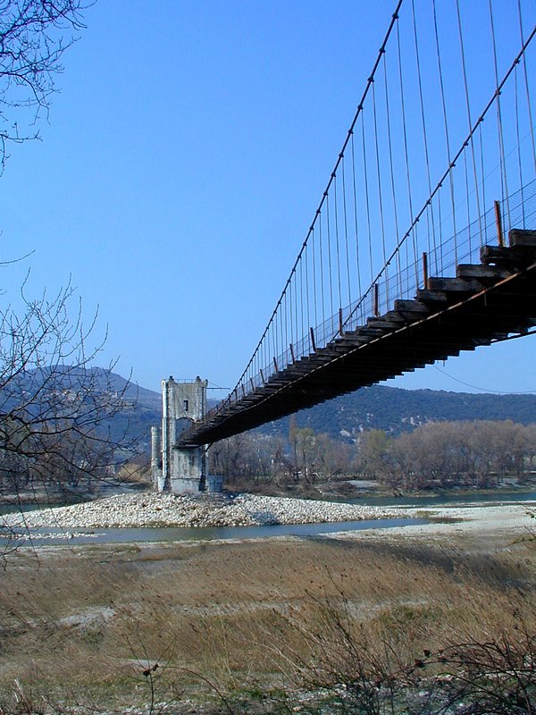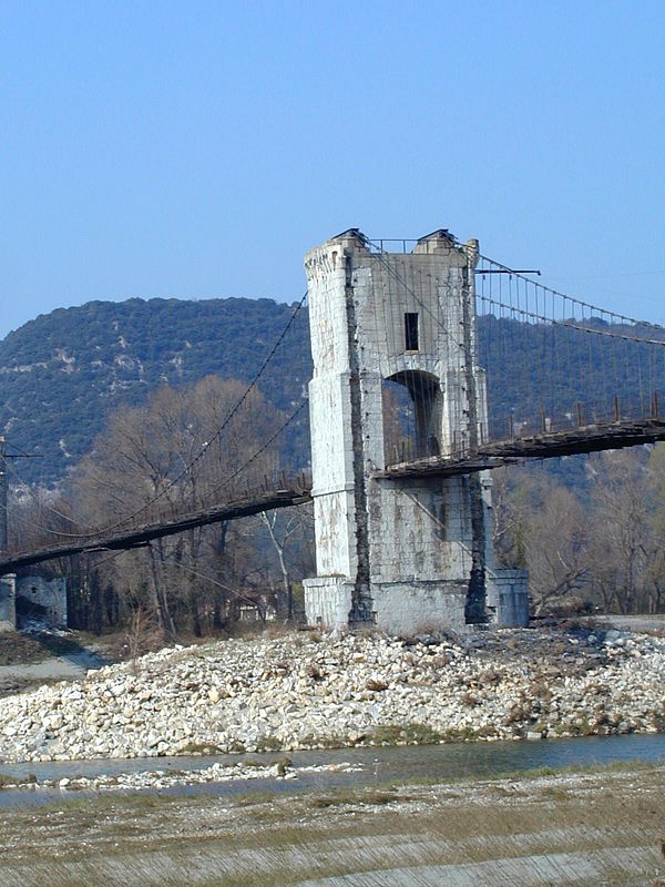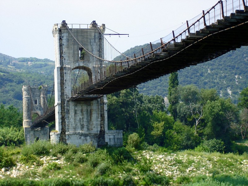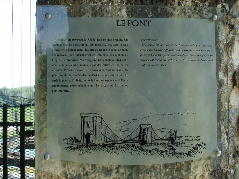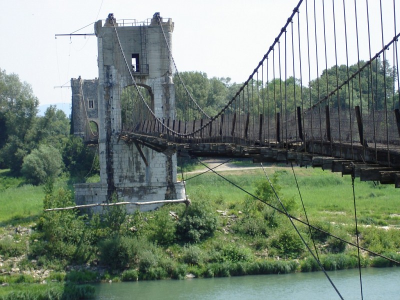 Il semble qu'après la destruction du pont en 1856, ce pont fut reconstruit en 1858. Il subit des travaux de réfection en 1934, par l'Entreprise Arnodin pour un montant de 10.510 Fr. Il est toujours en place (2006).