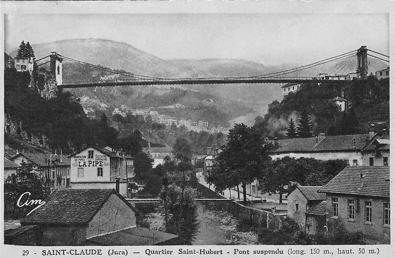 Le pont suspendu de St Claude fut construit en 1844, et inauguré les 29 et 30/11/1845. Partant de la montagne "Les Etappes", il aboutit à la place St Pierre. Sa longueur est de 148 mètres. La vallée du Tacon qu'il traverse est de 55 mètres au-dessous du tablier, qui a 7.30 mètres de largeur - trottoirs compris. Aux deux entrées s'élèvent deux portiques de 17 mètres de haut et de 10.6 mètre de large. Ce pont est l'oeuvre de MM Escarraguel freres de Bordeaux, et MM Falque frères, architecte à Marseille, sous la direction de M. Monnet et De LaRue, ingénieurs du Département.