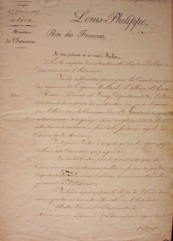 - Ordonnance royale autorisant la construction du pont de Saint Gervais sur l'Isère en 1837