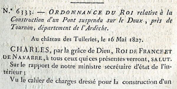La construction du pont suspendu est autorisée par Decret 16/05/1827 - Pont sur le Doux près de Tournon référencé en (2). Ce document intéressant présente aussi le détail des conditions d'exploitation du pont et des péages fixées dès le 6 Janvier 1827. |