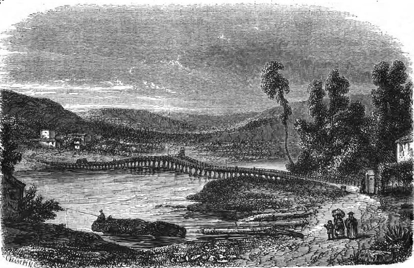 Ce pont situé près de l'embouchure du Var sur la commune de Saint Laurent du Var, à 9 km de Nice, est en 1845, la seule voie de communication qui unit le royaume de France et les Etats Sardes. En son milieu sont placées les sentinelles piémontaises.