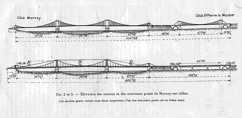 Ce pont suspendu à double-voie sur l'Allier, dont l'autorisation fut accordée par ordonnance royale le 24/12/1837 (1), permet de relier Sancoins à Saint-Pierre le Moûtier, via Mornay-sur-Allier au service de la route royale N° 151 bis, d'Angoulême à Nevers. L'initiative du projet revient à Sieur Ferdinand Ruiz selon (3), pourtant l'adjudication réalisée le 28/6/1838 est faite en faveur de Sieur Louis Dupan en contre-partie d'une concession de 49 ans. L'ouvrage (2) complété par (4), précise que ce pont fut construit en 1840, et qu'il est alors constitué de 3 travées suspendues par fil de fer, pour une longueur totale de 210m et une largeur de 5.45m. Il est complété par un autre pont de 2 travées comme l'indique le graphique ci-dessous. Les travées ont une longueur comprise entre 67 et 80 m. Les deux ponts sont séparés par un ilôt de 48m 30, ce qui conduit à une longueur totale de la traversée de 344.6 m :
