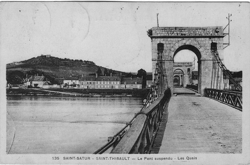 La construction du pont Saint Thibault de Saint Satur, sur la Loire à proximité de Pont de Cosne-sur-Loire (Grand bras) a été autorisée par Ordonnance du Roi Louis-Philippe en Aout 1832. Elle débute effectivement ce même mois du côté de Saint Thibault. Il y est fait référence dans Les Scènes de la vie de province. T. 2. d'Honoré de Balzac. Particulièrement robuste il tiendra un siècle avant d'être remplacé par un nouveau pont en 1934. |