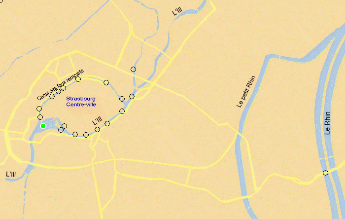 Fleuve franchi : l'Ill, département : Bas-Rhin, à proximité : Strasbourg, situé Ponts Couverts