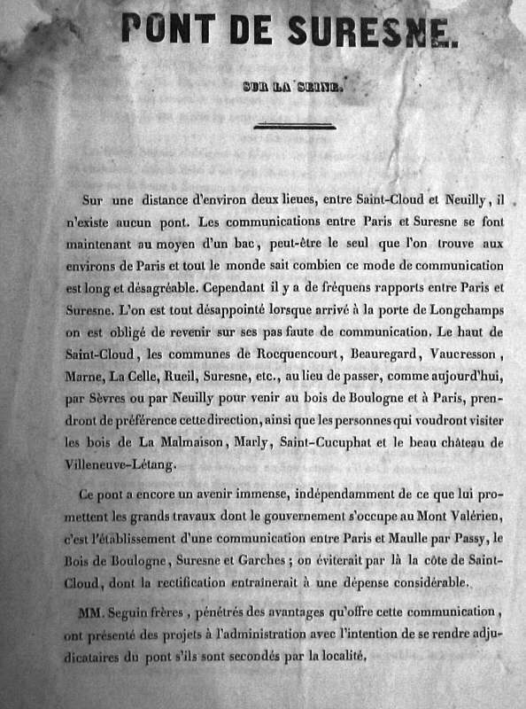 Un projet de pont est établi en 1837. Nous savons effectivement que les frères (Paul et Charles) Seguin ont participé à l'établissement du projet de pont à Suresnes sur la Seine à hauteur de la porte de Longchamp, comme l'atteste le document produit ci-contre (extrait du fonds Seguin) mais peut-être ceci est-il resté à l'état de devis. Ce document précise le projet de levée de financement entre les deux frères Paul et Charles Seguin, pour ce pont, daté du 4 Septembre 1837, à hauteur de 250 000 Fr si le pont est à une voie ou de 300 000 si le pont est à deux voies. |