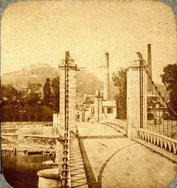 Détruit en 1870, il semble avoir été reconstruit en 1874. Le rapport du Ministère de 1889 indique que le pont n'est plus suspendu. En effet le dessin le réprésentant vers 1875 le montre constitué de 3 arches metalliques.