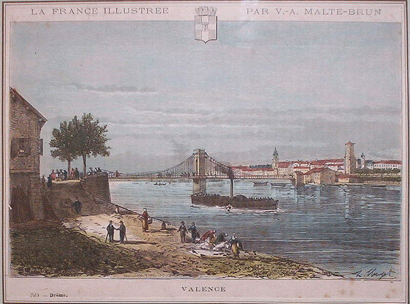 Jules Seguin obtient l'autorisation de construire un pont entre Valence et les Granges en 1827. Il est livré au public en Septembre 1830. Il fait 220 mètres de long et 7 de large. Les piliers sont construits en pierre calcaire de Crussol. A noter, le 31 janvier 1885, une foule considérable fête la suppression du péage sur le pont Seguin, l'Etat ayant racheté la concession qui assuraient des dividendes confortables à ses actionnaires.