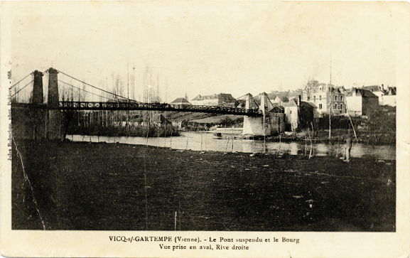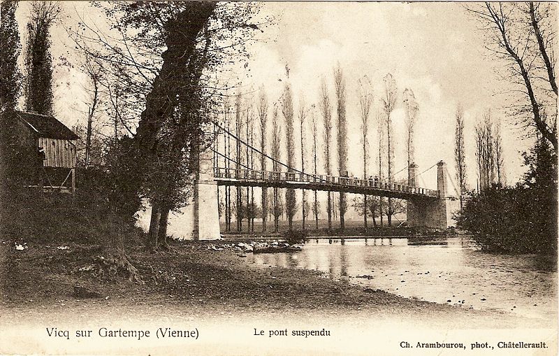 L'ordonnance qui autorise la construction d'un pont suspendu sur la Gartempe en remplacement du bac de Vicq date du 16 Août 1836 (5). Selon le cahier des charges : « Les travaux seront exécutés dans un délai de deux ans au plus, à dater de l'approbation de l'adjudication. Le pont sera construit à peu près dans l'emplacement du gué actuel. La longueur du débouché des eaux, entre les culées, et en une seule traversée, sera de soixante mètres. La largeur du passage entre les faces intérieures des garde-corps sera de quatre mètres quarante centimètres. La surface inférieure du tablier, au milieu de la travée, sera élevée de six mètres cinquante centimètres, au-dessus de l'étiage : cette hauteur pourra être réduite à six mètres près des culées. »