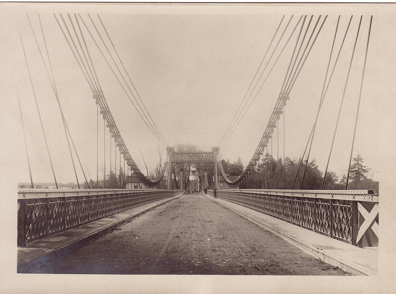 D'après la référence (5), le pont a été détruit par malveillance en 1870, et (4) rajoute que ceci s'est produit par rupture de câbles sous la hache des républicains conduits par SICARD, dit le Manetz ; ceci pour protester contre le péage ! (5) complète en indiquant que le pont fut reconstruit en 1872.